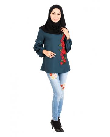 QA-413 Women Rose Embroidery Blouse Ocean Green