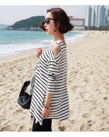 BM71038 Stylish Cut Out Sleeves Top Stripe